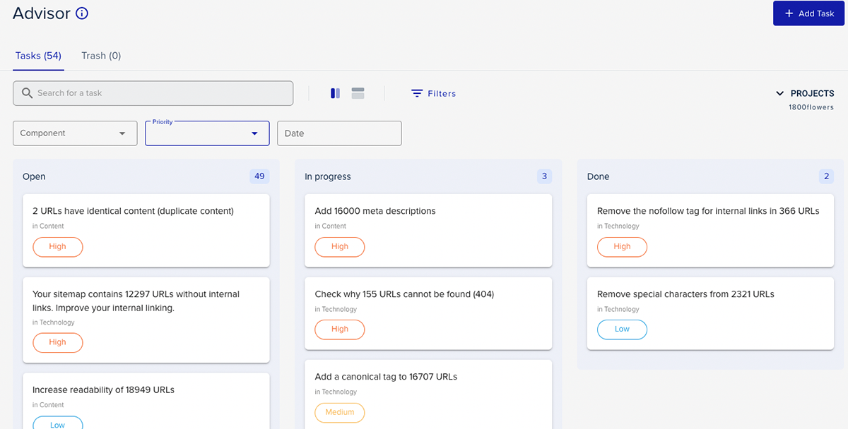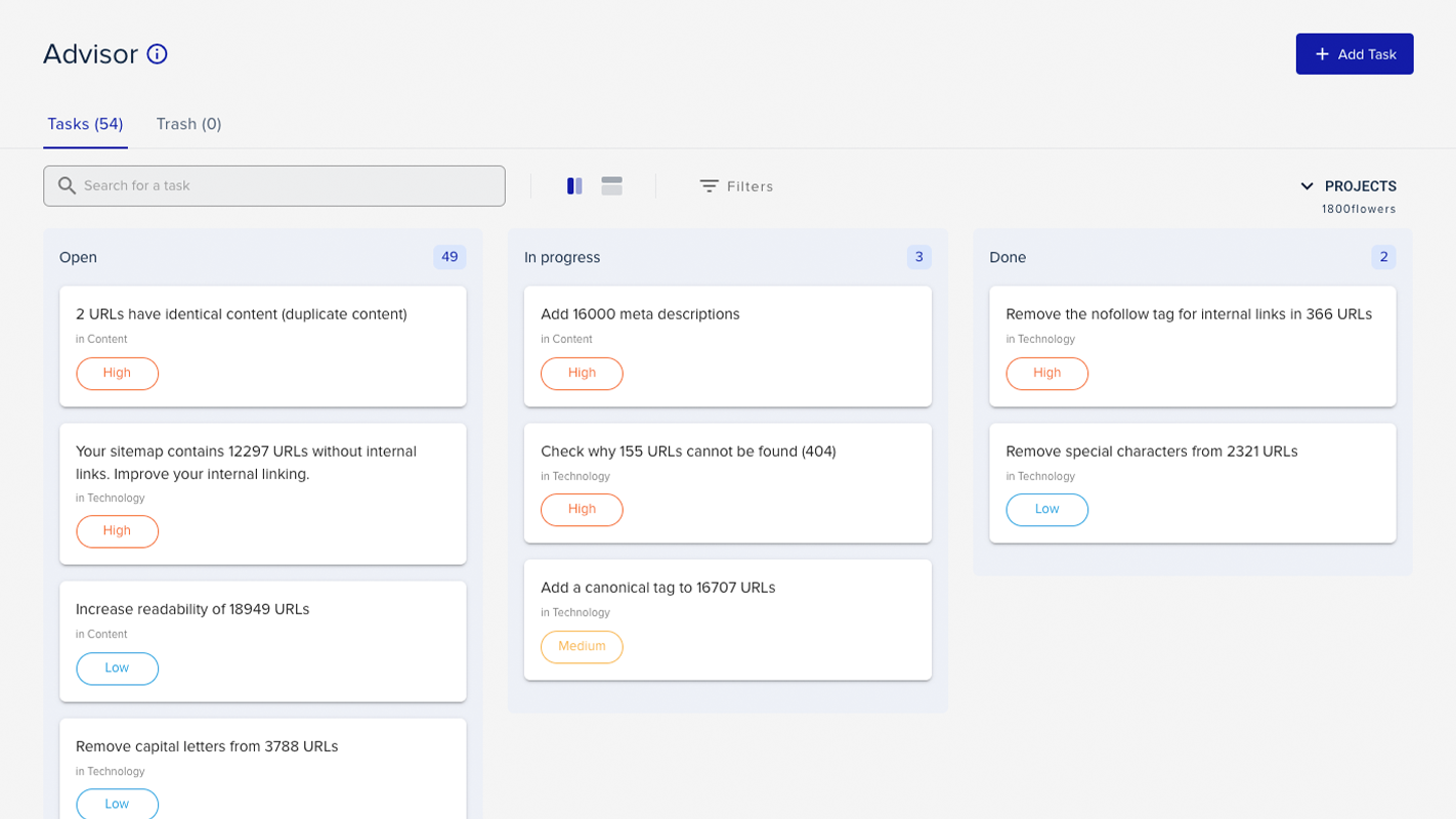Gardez à l'esprit que vous avez besoin d'un Projet pour utiliser la fonctionnalité Advisor. De plus, la plupart des tâches de la fonctionnalité Advisor sont adaptées au site web d'un projet (généralement le vôtre ou celui de votre client). Si vous gérez plusieurs sites web, vous devrez créer un projet supplémentaire pour chacun d'eux.