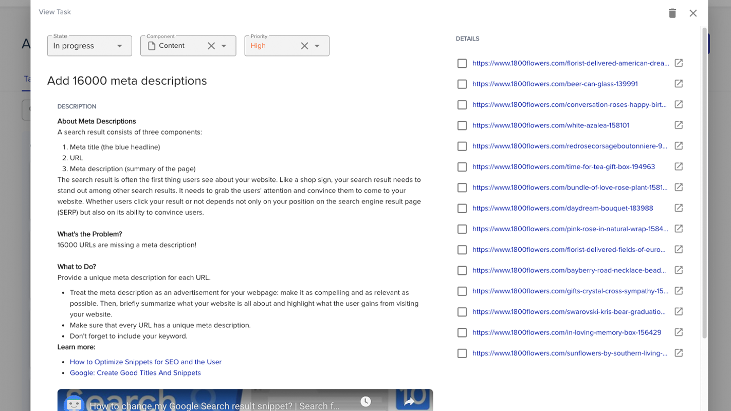 Comme indiqué ci-dessus, les tâches sont un mélange de mesures SEO de base standard et de problèmes détectés lors des audits automatisés hebdomadaires de votre site web.